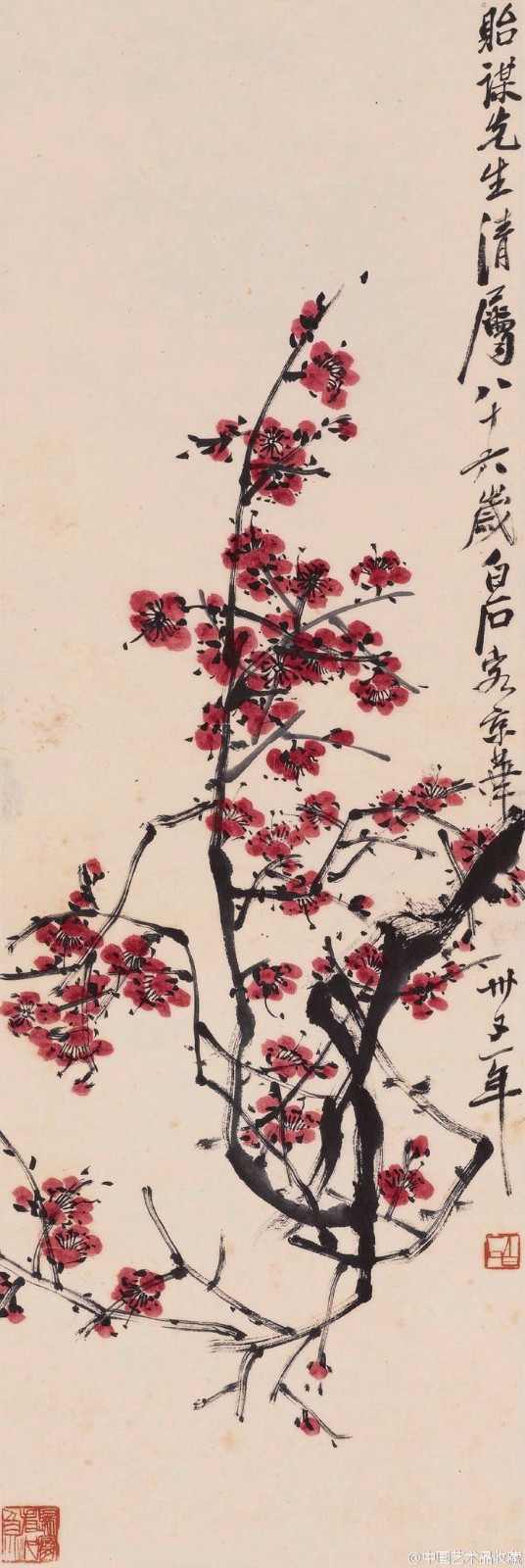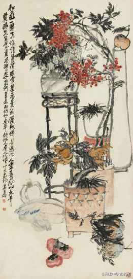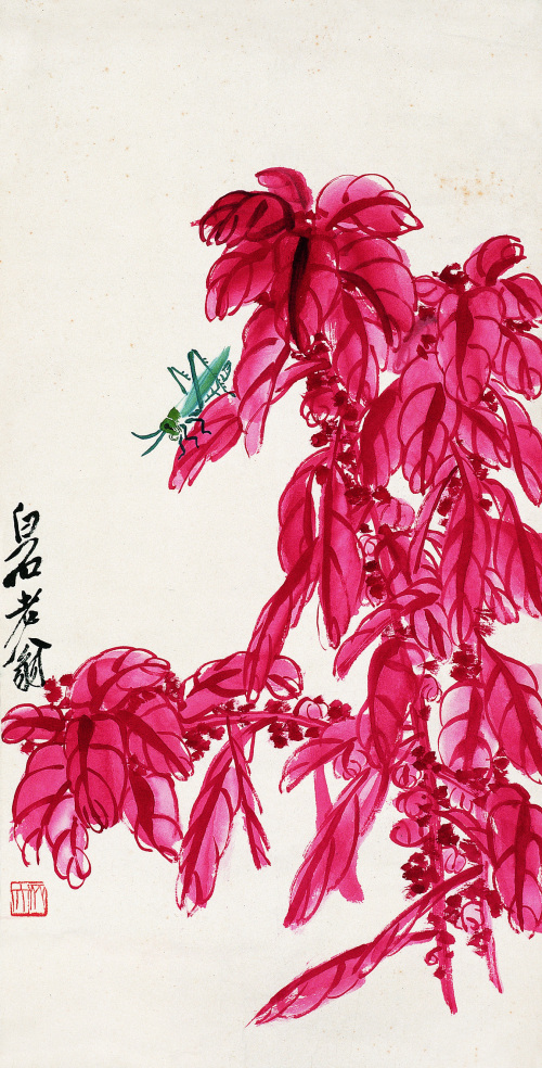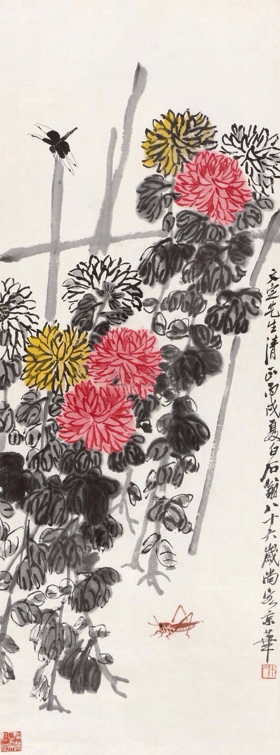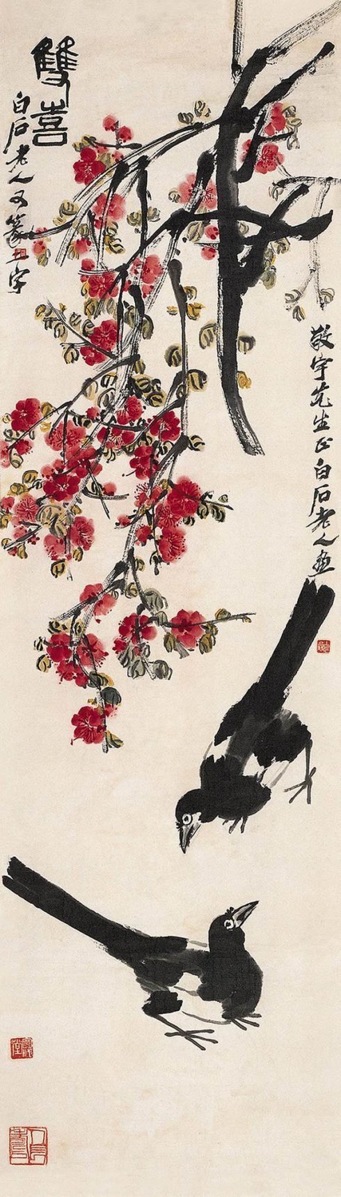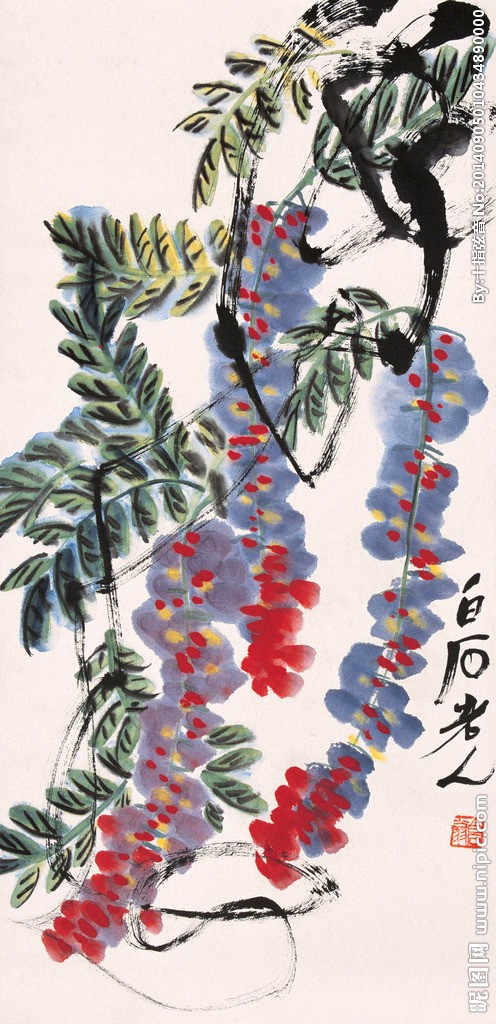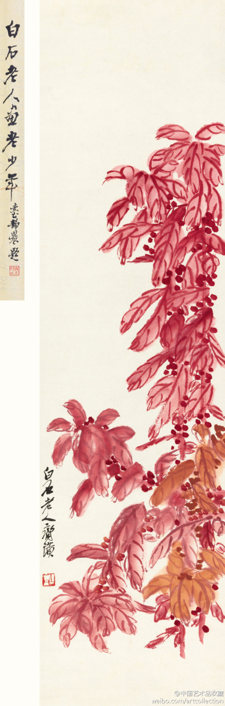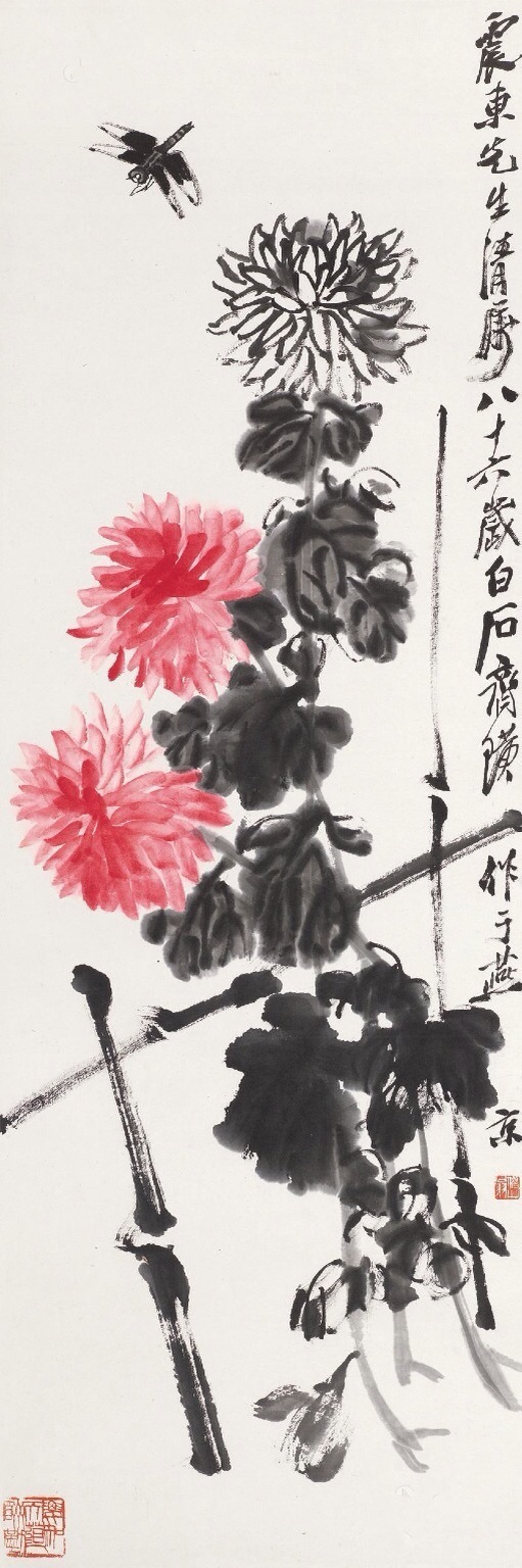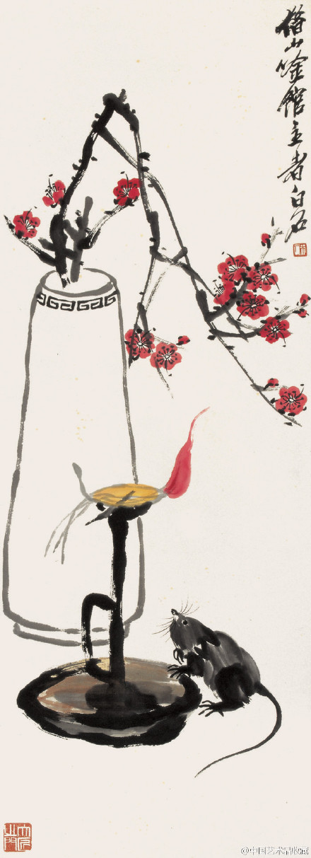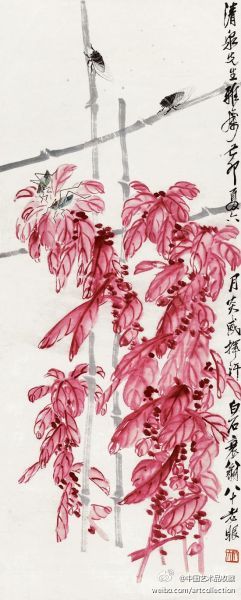 白石在北京定居后,内心却是“故里山花此时开也”,的思想轨迹。齐白石不可能将家乡草木赶过黄河带到北京,但家乡草木却作为一种自然信息随齐白石来到北京,并化作艺术信息传达出来,以实现齐白石心理的平衡。齐白石刻了许多寄托着怀乡之情的闲文印,如“吾家衡岳山下”、“客中月光亦照家山”,是齐白石自抒胸臆的第一主题。