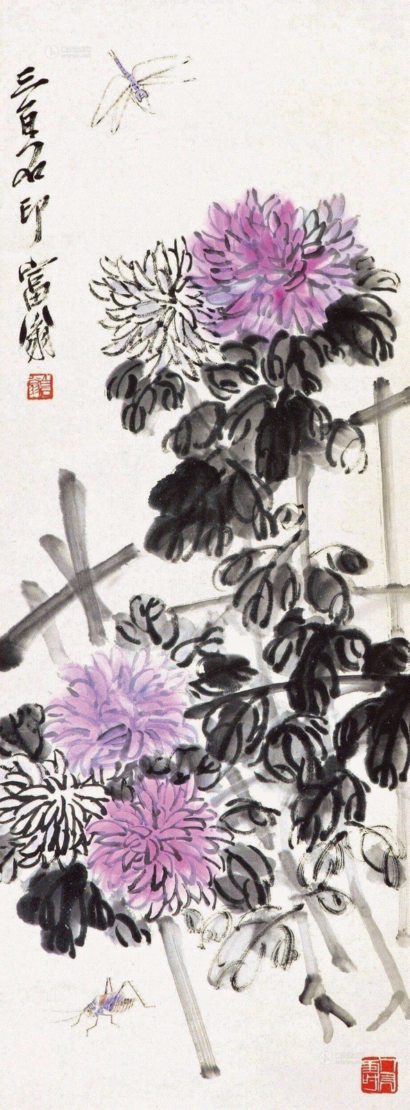 齐白石笔下的钟馗、寿星、仙佛一类作品,也是农民们聊天时嘴边上的对象。这类作品,是齐白石的恋乡情结和童真情趣的自然流露,是“以农器谱传吾子孙”的愿望,是一种有异于“诗书传家远”的农民意识的自觉的表白。当齐白石画《白菜辣椒》时,不仅有感于红与黑的对比,同时也为“牡丹为花之王,荔枝为果之先,独不论白菜为菜之王”,而愤愤不平;齐白石在有关画白菜的题句中,所表示的“不是独夸根有味,须知此老是农夫”,“不独老萍知此味,先人三代咬其根”,正是《农耕图》中的那位老农的自白。也是齐白石对本色、本质毫不掩饰的自我肯定。