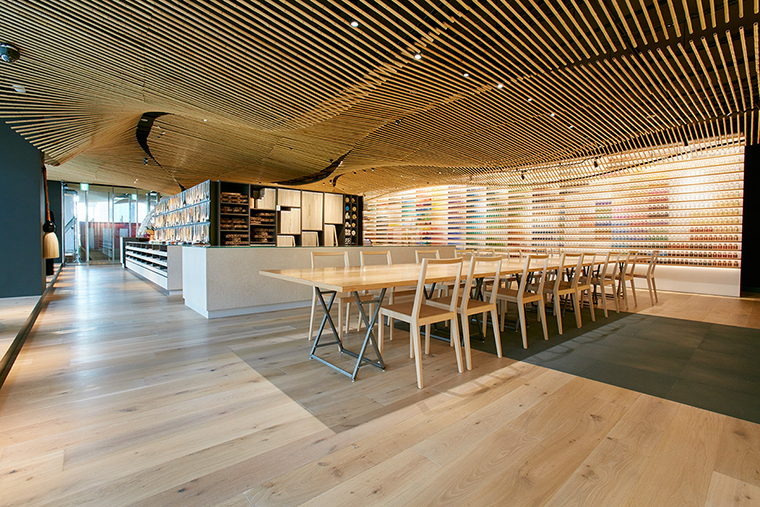 画具研究室pigment,由日本建筑大师隈研吾设计,用传统的材料—竹子装饰门店。天花板用细密的竹条排布成波浪的感觉,有细微的起伏变化和层次感。竹条的缝隙中露出黑色的天花板,让这里显得深邃,是一个有艺术感的地方。