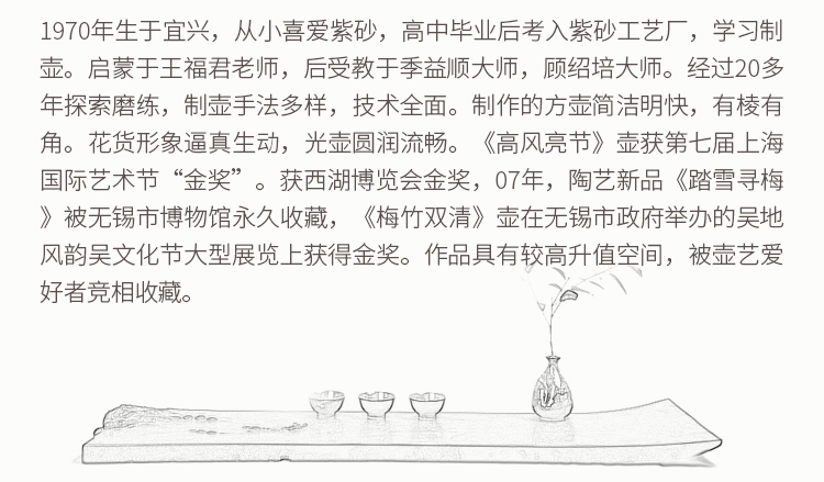 经过20多年探索磨练,制壶手法多样,技术全面。制作的方壶简洁明快,有棱有角。花货形象逼真生动,光壶圆润流畅。《高风亮节》壶获第七届上海国际艺术节“金奖”。获西湖博览会金奖,07年,陶艺新品《踏雪寻梅》被无锡市博物馆永久收藏,《梅竹双清》壶在无锡市政府举办的吴地风韵吴文化节大型展览上获得金奖。作品具有较高升值空间,被壶艺爱好者竞相收藏。